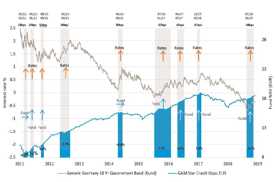 With yields on global fixed income close to record lows at 0.9%, investors in classic bonds are left vulnerable to a potential rise in rates, with only limited income buffer. Our approach is different and has in the past shown itself to be resilient to rate rises. Given the most recent rise in US rates, we have received several queries from investors, asking us if we believe this is a concern for our strategy and the fund. Our response has been straightforward: “No, on the contrary”. The reason for this is twofold: i) We have positioned the fund to have low sensitivity to rates and ii) Subordinated debt, especially subordinated debt issued by the financial sector, tends to benefit from a rising rate environment.